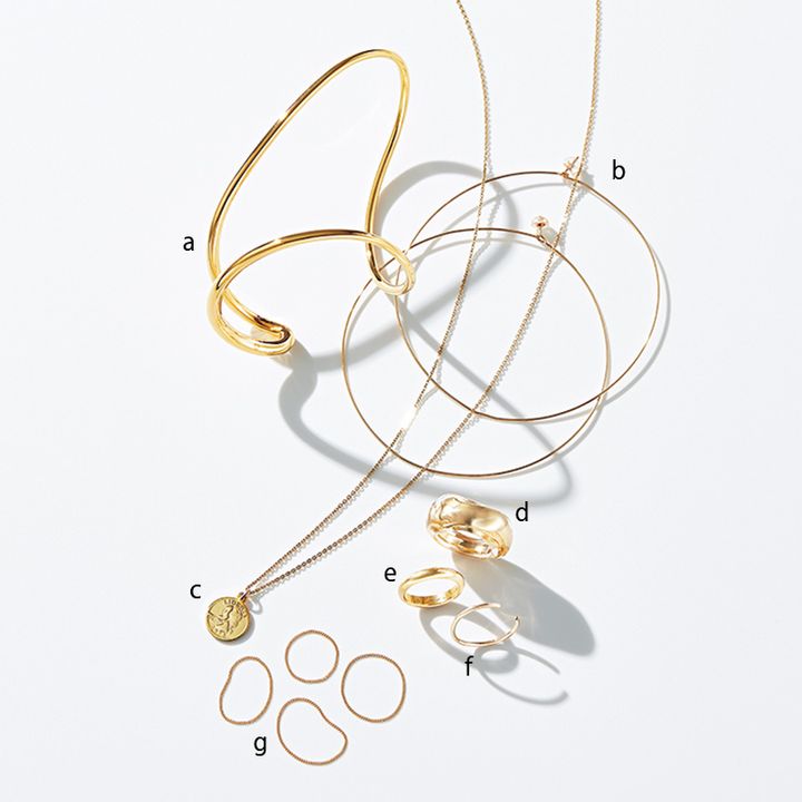 a.ヘルシーな夏の手元に、ニットの袖口から覗かせてと、使い勝手抜群なシャルロット シェネのバングル。b.何年も前にロクで買ったピアスは大きさと線の細さが絶妙。c.超ロングなネックレスはリラ。d.クリア使いが涼しげで、アメリヴィンテージで一目惚れ。e.マリッジリングはカルティエ。f.トゥモローランドで購入した親指リングで洒落感アップ。g.パティエラのチェーンリング。5本買ってその日の気分で使い分け。