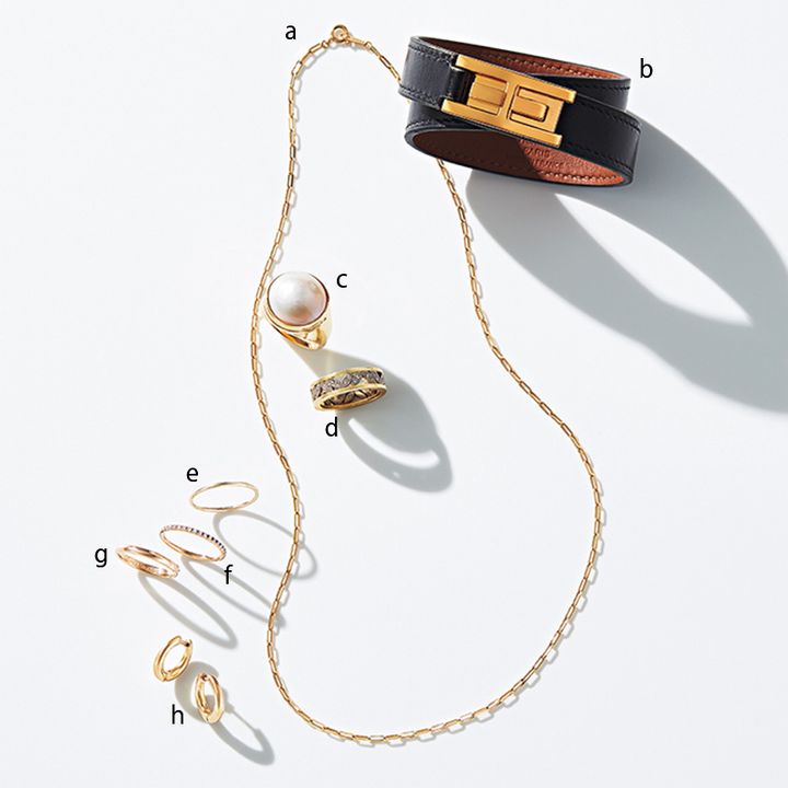 a.インスタで見つけたruur。オーダー制作の18Kチェーンネックレスは作りの良さが魅力。b.エルメスのレザーブレスはラフな中にもきちんと感を出したいときに。c.大ぶりなパールリングはマーガレットスミス。d.グリーンゴールドの色味に惹かれたhumのリーフデザインリングは2年分の誕生日祝いとして購入。e.華奢さが絶妙なリングはオーロラグラン。f.g.マリッジ、メトロリングはともにティファニー。h.ピアスはhum。