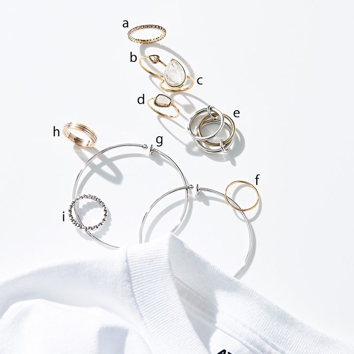 a.MHTはTシャツ時季になると登場。b.肌に馴染む喜平チェーンのブレスはキウナ。c.トムウッドのピアスはつけっぱなしできる小ぶりさがお気に入り。d.e.“ファッションとしてつけやすい”目線で選んだマリッジとエンゲージはデビアスのもの。f.ヒロタカのピンキーリングは華奢さがお気に入り。g.ティファニーのナイフエッジ。h.10年越しに購入したバランス。