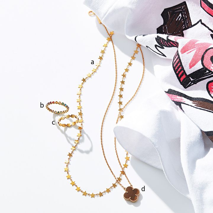 a.b.c.はすべてマリーエレーヌ ドゥ タイヤック。ネックレスは10年前のパリ旅行で購入し、リングはデザイナーが来日した際にご本人に見立ててもらった思い出の品。色石エタニティは一点物なのでサイズが少し大きく、リップのリングをセットで購入してストッパーに。d.VCAのヴィンテージ アルハンブラはタイガーズアイ。地金と馴染みの良いワントーンで使い勝手が抜群です。