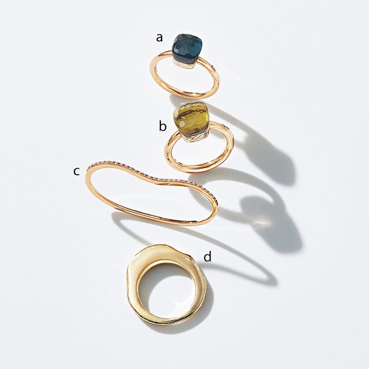 a.b.ともにポメラート。20代からの憧れブランドでいつかはと思っていたので40代の節目に。石の持つパワーを吟味した末、自分を高めてくれるレモンクォーツを。その後重ねづけ用にロンドンブルートパーズを買い足しました。深いブルーの効能は「判断力や決断力を高める」。愛でるだけで力が湧きます!c.d.ともにブランイリス。次男の抱っこ期卒業のときの華奢ジュエリー気分にフィットしたもので、セットで購入しました。