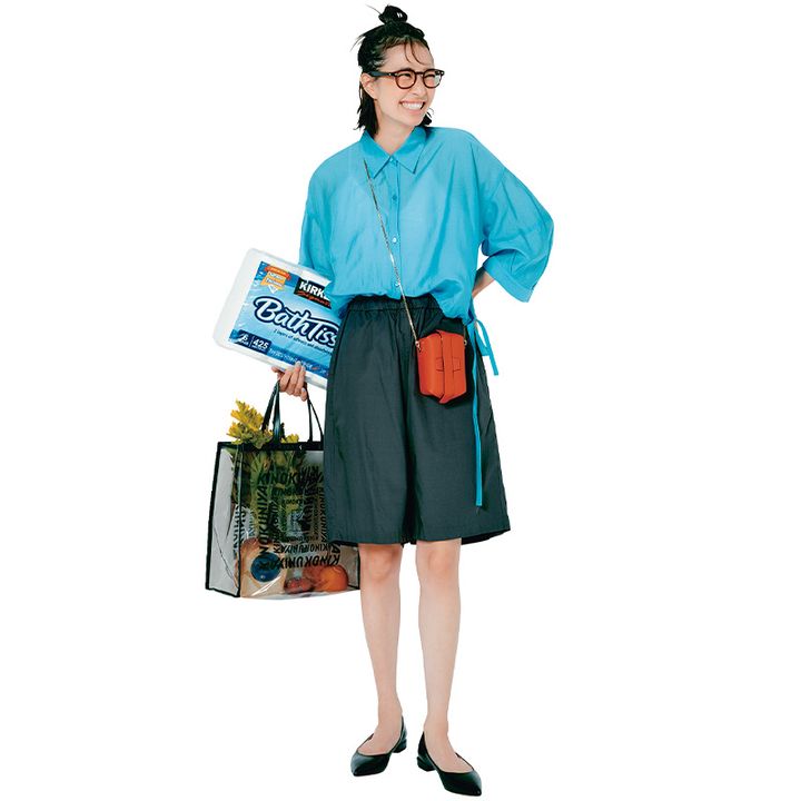 シャツ¥26,400(アルアバイル)中に着たキャミソール¥6,930(アンダーソン アンダーソン)ハーフパンツ[メンズ]¥15,400(フレッシュサービス/フレッシュサービス ヘッドクオーターズ)メガネ¥47,300(モスコット/モスコット トウキョウ)バッグ¥203,500(ヴァレクストラ/ヴァレクストラ ジャパン)シューズ¥34,100(ファビオ ルスコーニ/ファビオ ルスコーニ ルミネ有楽町店)