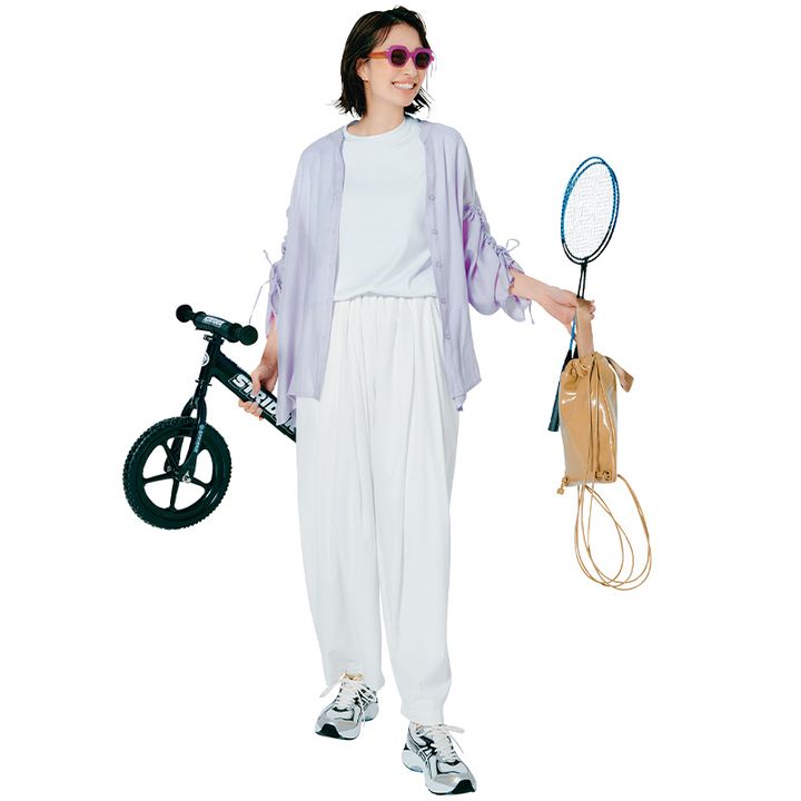 オール白のアクティブコーデに奥行きを出してくれる薄パープルのシアーシャツ。スポーティなシャカシャカより女っぽさも足せる。