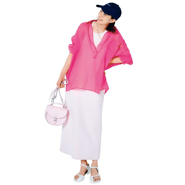 シアーシャツ¥23,100(カデュネ/カデュネ プレスルーム)ワンピース¥23,980(アンクレイヴ ホワイト/アンクレイヴ)キャップ¥7,150(フレッシュサービス/フレッシュサービス ヘッドクオーターズ)ショルダーバッグ¥29,700(ケンブリッジ サッチェル/エスビービー)ネックレス¥103,400(ブランイリス/ブランイリス トーキョー)シューズ¥29,700(シーセイ/アイネックス)