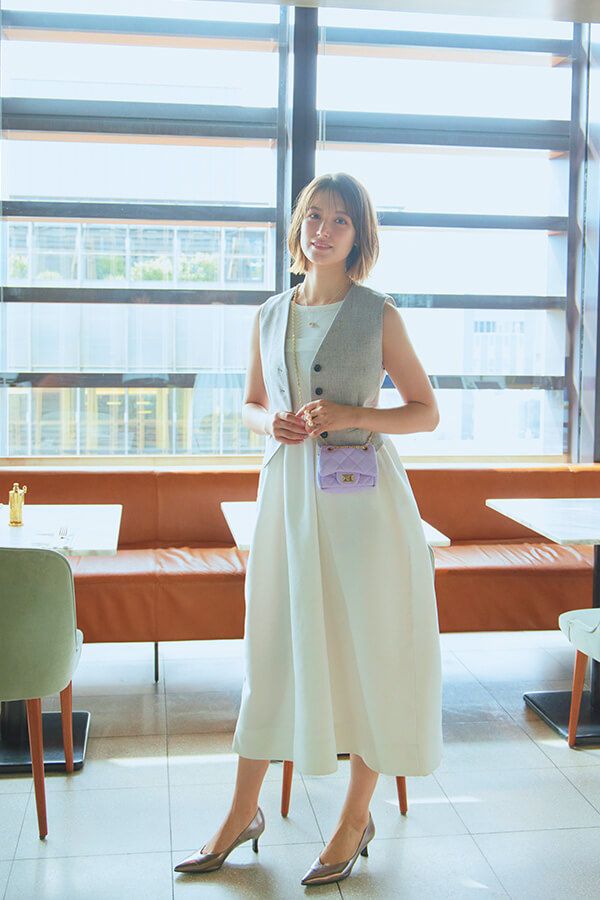 グレージュのジレをレイヤードすることで、プレーンな白ワンピに秋の重厚感を。マイクロサイズのカラーバッグで可愛らしさも盛り込みつつ、メタリックのパンプスで足元にはパンチをひとさじ。