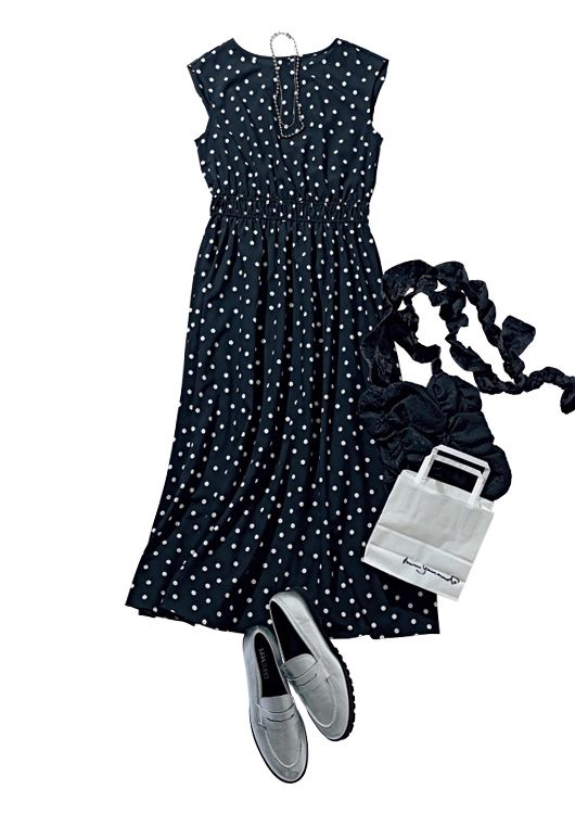 GUの水玉ワンピは黒ベースだから1枚で大人っぽく。肩を出しすぎず着られるから清楚な印象も得られます。エッジィなローファーとギャザーバッグで遊び心もプラスして。