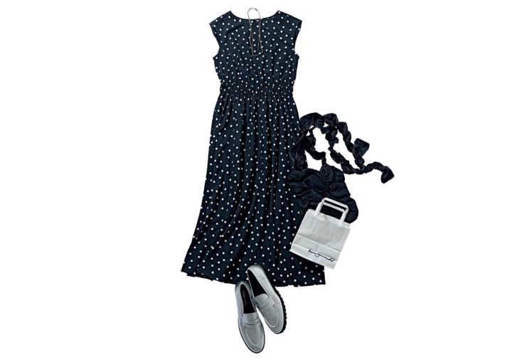 水玉ワンピース¥2,990/GU ギャザーショルダーバッグ¥5,940/キャセリーニ ローファー¥39,600/ブランベール(ウールン商会) ネックレス¥2,800/ミーティア(ロードス)