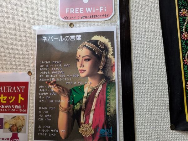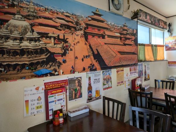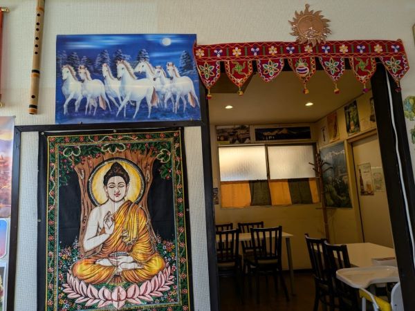 日本風の瓦屋根の建物なのですが、よく見ないとそうとは気づかないくらいに、賑やかな色使いが目を惹くレストラン。ドアの横に飾ってあるスパイスの飾りに気持ちも高まって、入店です。壁いっぱいに大きな写真が貼ってあったㇼ、インドやネパールを感じさせるタペストリーなどが飾ってあり、中もとっても賑やかな雰囲気です。