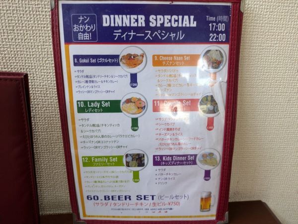 ディナーにもナン食べ放題のセットがあります。他にもおいしそうな単品料理が多数ありました。