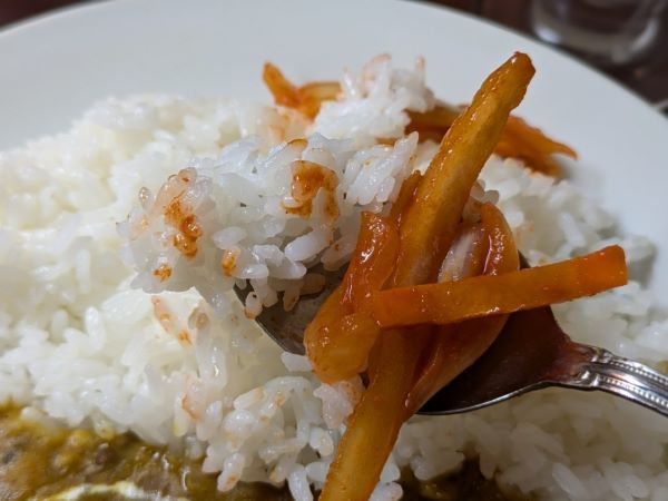 そして「とっても辛いですよ」と言われていた玉ねぎのアチャールは、激辛好きの私もちょっとびっくりの、超辛です!でもこれが暑い夏にぴったりで、固めに炊きあげられた1合くらいあるご飯と一緒に、フーフー言いながら全部おいしくいただきました。
