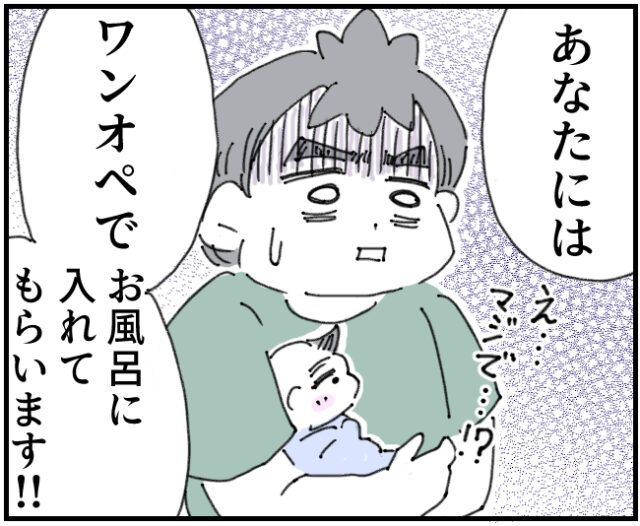 そして「あなたには、ワンオペでお風呂に入れてもらいます!!」と言い切るかおりさんに「え・・マジで・・!?」といちろうさんは自信なさげな表情を浮かべました。