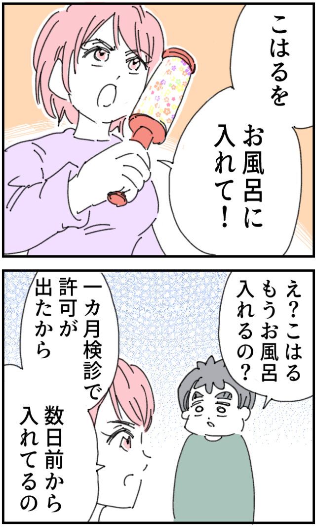 「その前にやって欲しいことがある」とかおりさんに言われたいちろうさん、それは「こはるをお風呂に入れて!」ということでした。「え?こはる、もうお風呂入れるの?」無邪気にそう言ういちろうさんに「一か月健診で許可が出たから、数日前から入れてるの」とかおりさんが答えます。