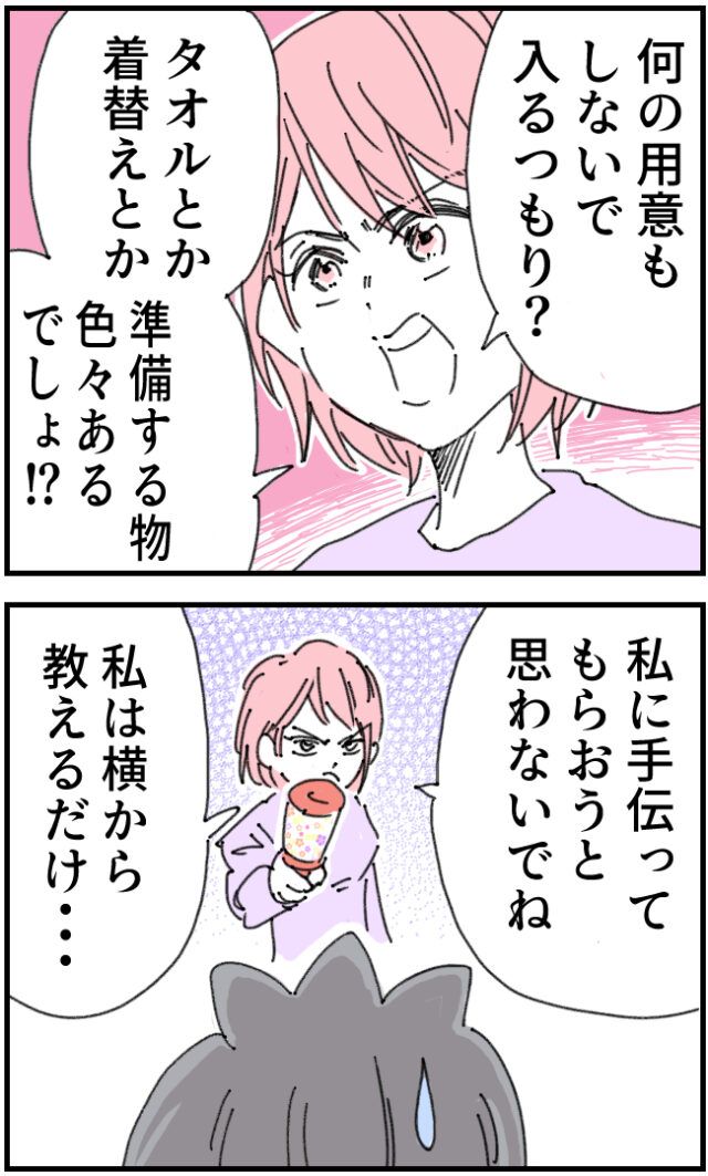 「何の用意もしないで入るつもり?タオルとか、着替えとか、準備する物いろいろあるでしょ!?」とかおりさん、「私に手伝ってもらおうと思わないでね。私は横から教えるだけ・・」といちろうさんがかおりさん任せにしないよう先に注意しました。