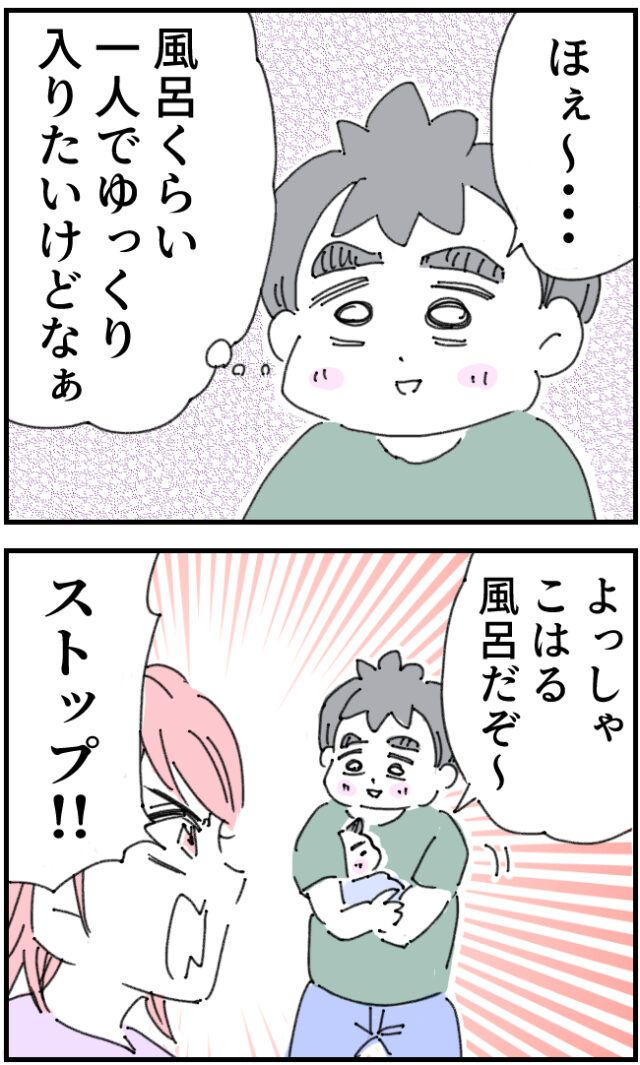かおりさんの言葉に「ほぇ~・・風呂くらい、一人でゆっくり入りたいけどなぁ」と思いつつ、こはるちゃんを抱っこして「よっしゃこはる!風呂だぞ~」と声をかけるいちろうさんに「ストップ!!」かおりさんが言いました。