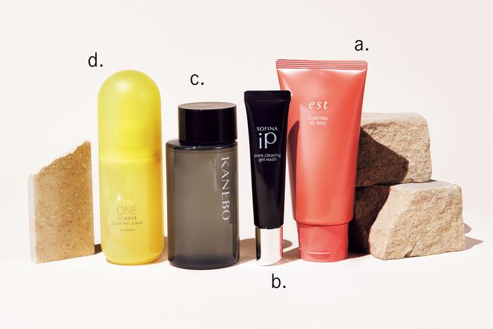 a.「毛穴ケアに関しては、個人的に花王の技術を厚く信頼しています!泡立たないジェルが、毛穴の角栓を分解洗浄。さらに酸化防止効果も」エスト クラリファイイング ジェル ウォッシュ130g ¥4,950(エスト)b.「小鼻などのザラつきが気になる部分の集中ケアに!たった30秒で、詰まりを溶かしてくれます」ソフィーナ iP ポア クリアリング ジェル ウォッシュ 30g¥1,980※編集部調べ(ともに花王)c.「肌荒れや乾燥の原因になる“悪玉化する皮脂”だけをOFF!毛穴ケアと保水ケアを同時に」カネボウ スキン ハーモナイザー 180㎖¥5,500(カネボウインターナショナル Div.)d.「今ある角栓や古い角質を一掃するだけでなく、くり返す角栓形成も抑制。朝晩使えるふき取り美容液」ONE BY KOSÉ クリアピール セラム 120㎖¥3,850※編集部調べ(コーセー)