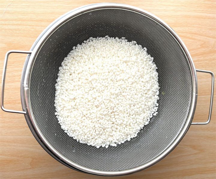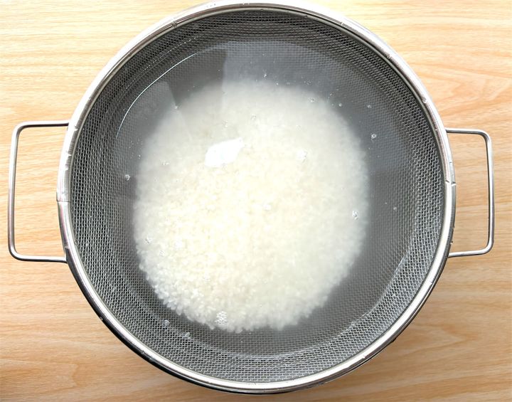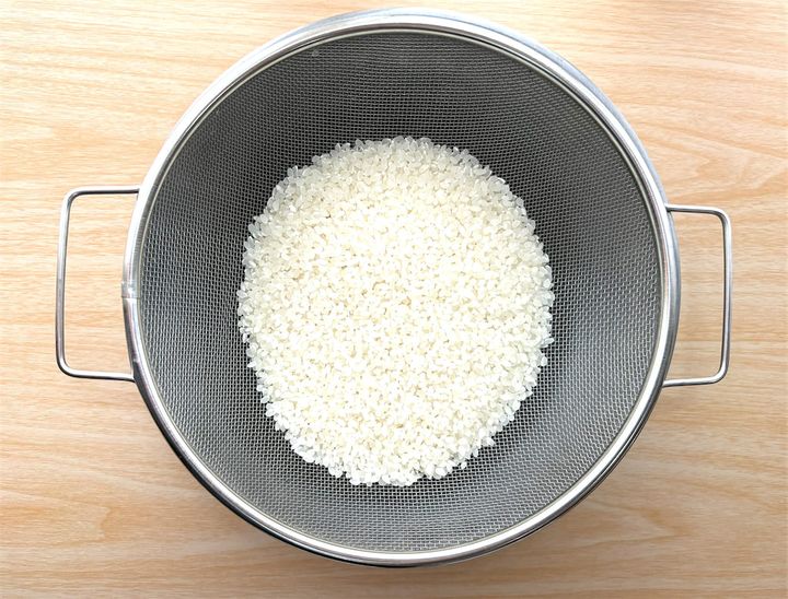 1の米を冷蔵庫から出して水を切り、ざるに上げて5分ほど置いておきます。