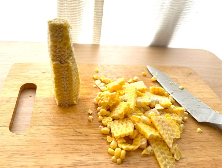 切ったとうもろこしを立てて、包丁で実をそぎ落としていきます。