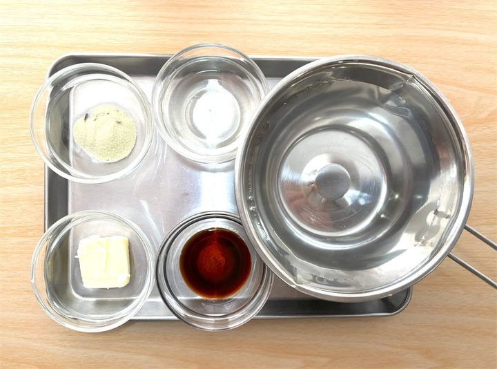 なので、ボウルに冷たい水、しょうゆ、酒を入れて混ぜ、調味液を作っておきます。
