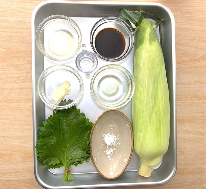 そこへ4の青じそと5の焼きとうもろこしを入れます。