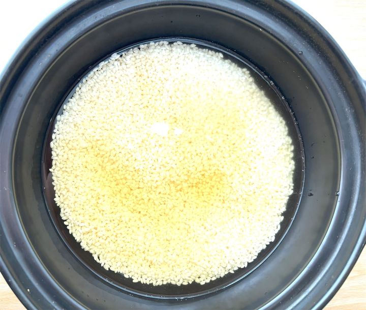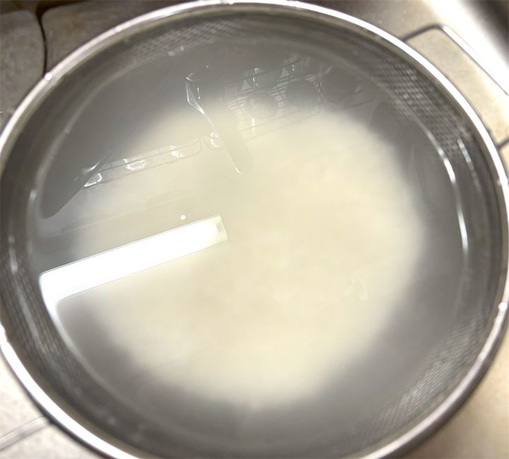 動画内では、一度ざるを外していましたが、わたしは後の工程を考えてざるをしたまま浸水させました。