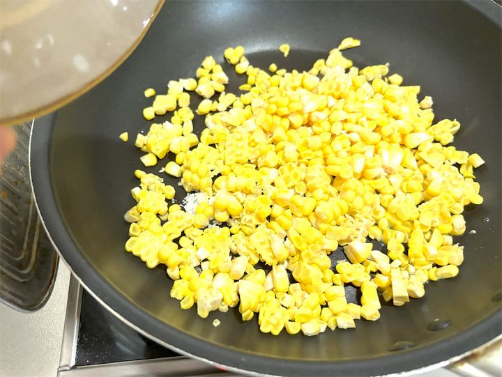 フライパンが温まったら、2のとうもろこしの実を入れて塩を加え、焼き色を付けるように炒めます。