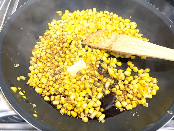 3. バター醤油の甘じょっぱい香りがそそる~♡フライパンでもろこし焼いて「極 とうもろこしご飯」作ろう!