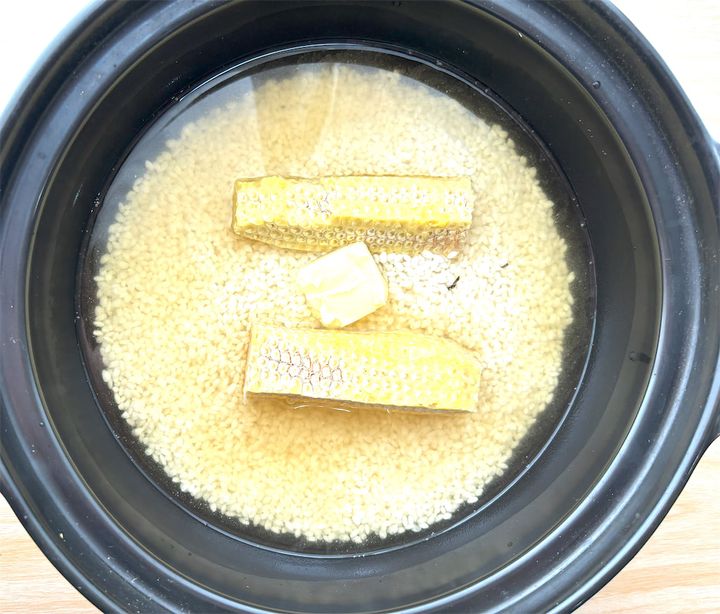 そこへ昆布茶を振り入れ、バターと2で取っておいたとうもろこしの芯を加えてフタをし、炊飯します。