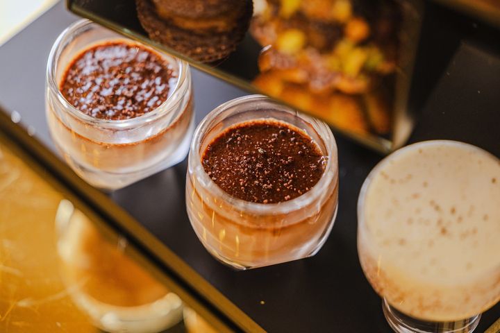 マダガスカル産カカオ100%のショコラを使用した「クレームブリュレ・ショコラ」は、カカオニブとカソナードを振りかけ上をカリッと焼いたグラスデザート。「ティラミス・ショコラ・カフェ」は、優しい味のマスカルポーネのクリームの中に、マダガスカル産カカオ75%のショコラを使用した滑らかなクリーム、東京工房で製造した香ばしいヘーゼルナッツとコーヒーのプラリネ、ビスキュイを忍ばせ、アクセントにコーヒー豆を擦り下ろしたパウダーをプラスしています。