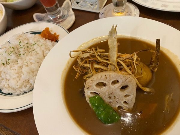 運良く限定の薬膳カレーに会えました! 季節のお野菜ということで、ゴロゴロ野菜がたっぷり入ってヘルシー! 大きな蓮根と揚げ牛蒡、ピーマン、玉ねぎなど。私の大好物ばかりで嬉しい! 更に、棗が入ってるのが珍しく、その味が、凄く私好みです!数種類のスパイスが複雑に混ざり合ったスープは、身体に優しく染みます。 薬膳カレーには麦ご飯がついてきたのですが、息子が思いの外、麦ご飯が美味しー!とパクパク食べました。
