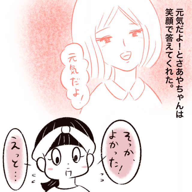 両親から愛情を向けられずに育ったさあやちゃんにしつこく絡まれるなどして悩まされていたまるさんでしたが、2年ぶりに再会したさあやちゃんは今はおばあちゃんのもとでしっかり愛情を受けて幸せそうな様子でした。昔のことを謝罪して帰ろうとするさあやちゃんに咄嗟に声をかけたまるさんですが、何を言えば良いかわからず「元気?」とズレた質問をしてしまいます。まるさんの問いかけに少し間をおいてから、さあやちゃんは「うん!元気だよ!」と穏やかな笑顔で答えました。