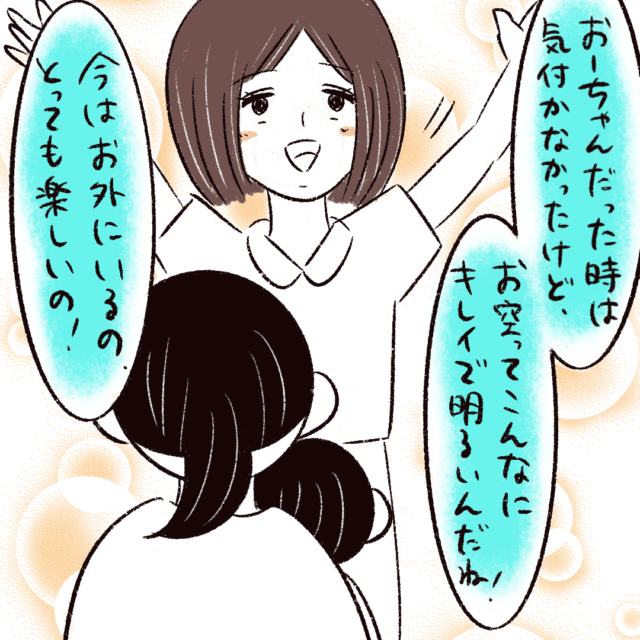 「おーちゃんだった時は気付かなかったけど、お空ってこんなにキレイで明るいんだね!今はお外にいるのとっても楽しいの!」明るい表情でそう話すさあやちゃん。以前は親に言われて公園などで時間を潰すしかなかったさあやちゃんですが、今は外にいることが楽しいと言います。