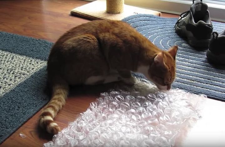 3. 「ヒマ、ヒマだにゃ!」退屈している猫、プチプチつぶしに夢中になる。