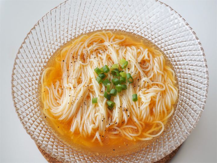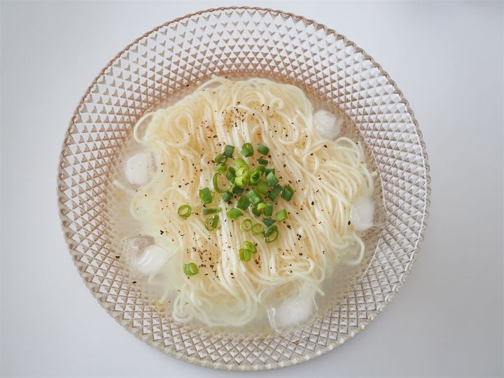 2. 茹でておいたそうめんを入れ、お好みで黒こしょう、青ねぎをトッピングしたら出来上がり!(お好みでレモン汁を入れてもOK)