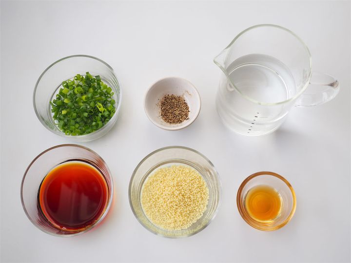 1. 器にしょうゆ、鶏ガラスープの素、ゴマ油、水を入れよく混ぜ合わせる。