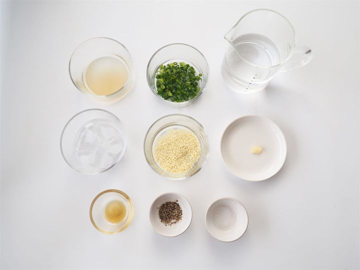 1. 器に水、鶏ガラスープの素、ゴマ油、塩、にんにくを入れよく混ぜ合わせる。最後に氷を入れる。