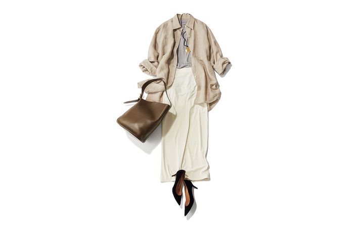 アイボリーで夏らしい爽やかさを足したニュアンスカラーコーデで、取引先ミーティング。「別れちゃったの?」って、もう(怒)!時々いるんだよね、こういうデリカシーのない人。面倒な人の話は、聞いてるふりしてスルースキル発揮が吉!ゴールドプレートネックレス¥35,640(ソコ/ZUTTOHOLIC)パンプス¥64,900(ペリーコ/アマン)バッグ¥169,400(J&M デヴィッドソン/J&M デヴィッドソン カスタマーセンター)