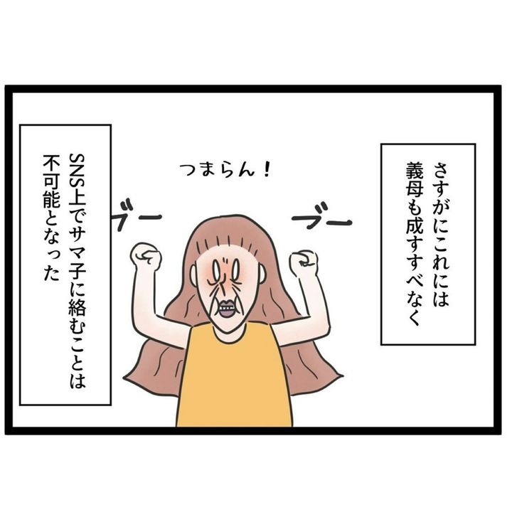 家族とのつながりを大切にするオーストラリアの文化を理解しつつも、義母とのやり取りを負担に感じるサマ子さんは距離感に悩んでいました。そんなとき、義母のスマホがアカウント乗っ取りの被害に遭い、義母はSNSをやめることになります。結果、サマ子さんの悩みは解消に向かったのでした。