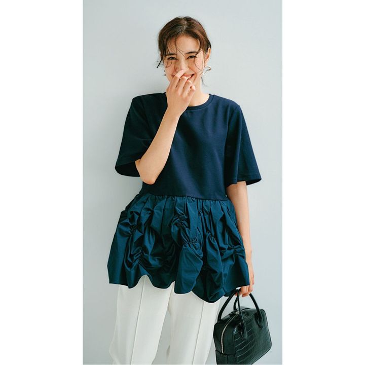 シャーリングが印象的なチュニックは ネイビーのきちんと感で通勤にも。 白パンツに合わせて清涼感を
