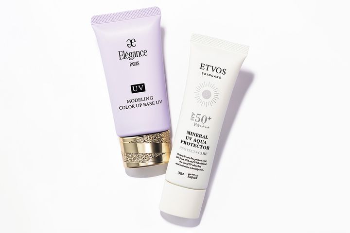 左:くすむ夏には紫かピンクを。エレガンスモデリングカラーアップベース UV LV660 SPF40・PA+++ 30g ¥4,950(エレガンスコスメティックス)