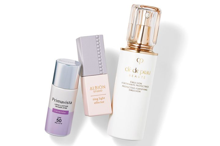 左から:くすみレスな透明肌に。プリマヴィスタスキンプロテクトベースラべンダーSPF50・PA+++ 25ml ¥3,080〈編集部調べ〉(花王)毛穴レス肌に。アルビオンスタジオリングライトエフェクター SPF20・PA++ 30ml ¥3,850(アルビオン)日中のUVをケア。エマルションプロテクトゥリス n 125ml ¥13,750(クレ・ド・ポーボーテ)