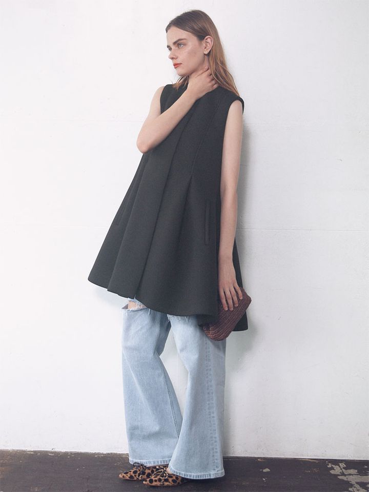 【POINT】構築的なすそ広がりでクラッシュデニムをささやかにドレスアップ。前開きだからアウターとしても使えるうえ、暑さものこる秋口にもうってつけ。