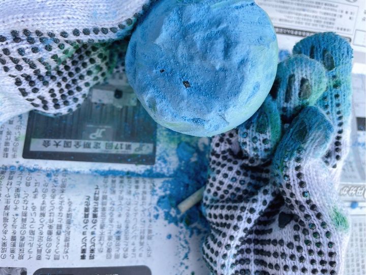 粉が飛び散るので、庭に新聞紙を敷いて作業してもらいました!