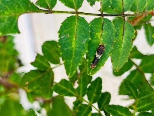 育ち盛りのアゲハ蝶系の幼虫により、若葉から順に青い葉っぱ全て食い尽くされました。