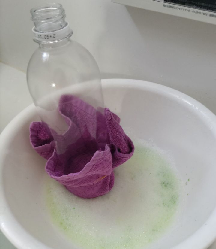 次に洗面器など、ペットボトルの底が全部付く大きさの容器にハンドソープなどを入れます。
