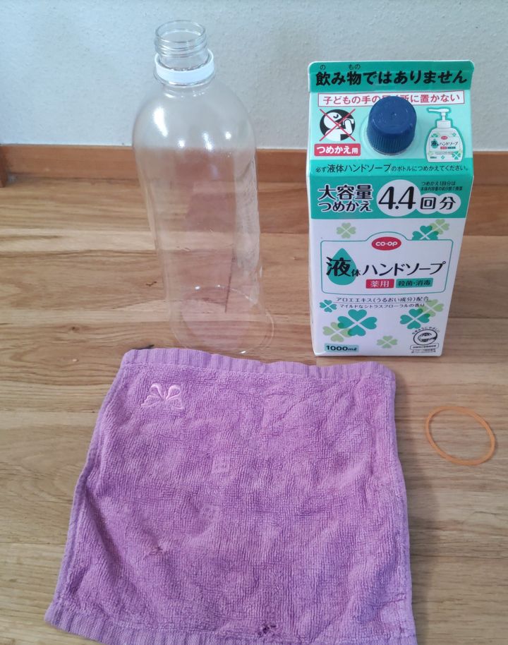 用意するのはペットボトルとタオルハンカチ、輪ゴム、ハンドソープやボディーソープ、もしくは石鹸水。