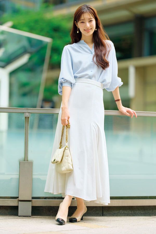 ブラウス¥2,990/UNIQLO スカート¥22,000/マイストラーダ バッグ¥17,050/ダイアナ(ダイアナ銀座本店) 腕時計¥18,700/マトウ(エイチエムエス ウォッチストア 表参道) イヤリング¥27,500/Grosse(グロッセ・ジャパン) パンプス¥23,100/銀座かねまつ(銀座かねまつ6丁目本店)
