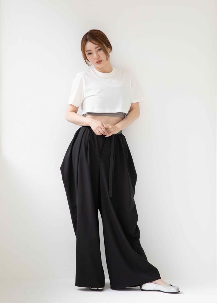 超ボリュームパンツにチビTで思い切ったコントラストを。「イウエンマトフのパンツは、無難な黒パンツではなくてコーデの主役になる黒パンツ。超ワイドシルエットが一番キレイに見えるコーディネートにしました」