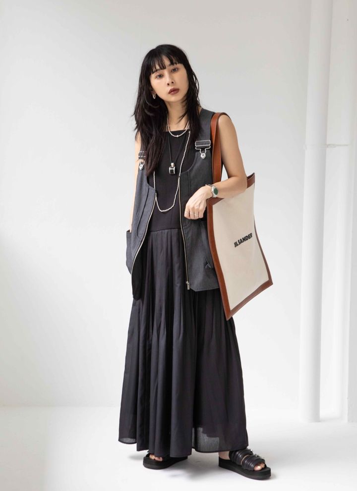 ジレのレイヤリングでブラックトーンに奥行き感のある着こなしを。「ウエストで切り替えになったロングドレスはワークベストとセットになっていながらも、カジュアル過ぎず気に入っています。シルバーのジュエリーでオールブラックにメリハリをもたせました」
