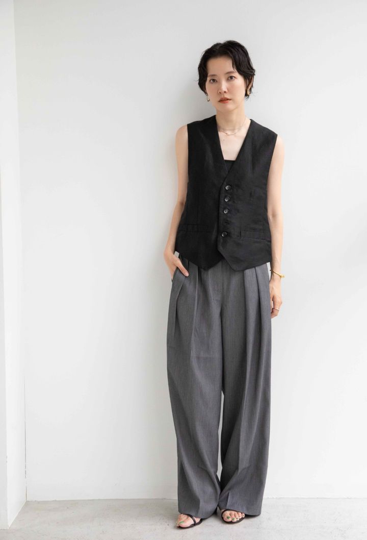 シンプルすぎないマニッシュなモノトーンは小物やメイクで調整を。「タック入りのワイドなスラックスにはコンパクトなベストを合わせてバランスUP。ベストは素肌に1枚で着て自然な肌見せをすることで、さり気ない女っぽさを忍ばせました」