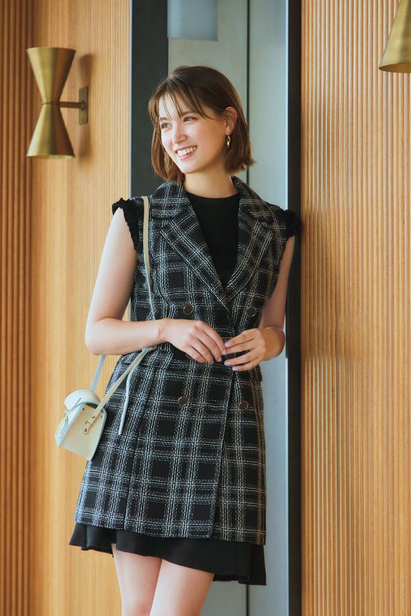 3. ミニワンピ風にも着こなせる♡モノクロのツイードジレで大人可愛い旬顔コーデ